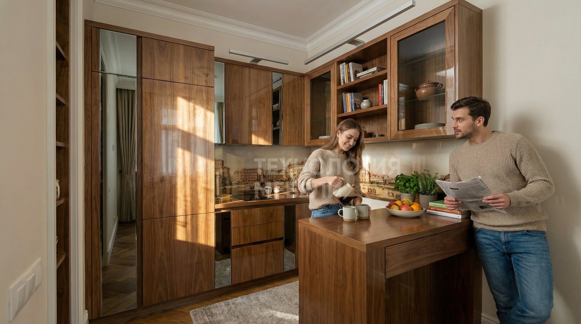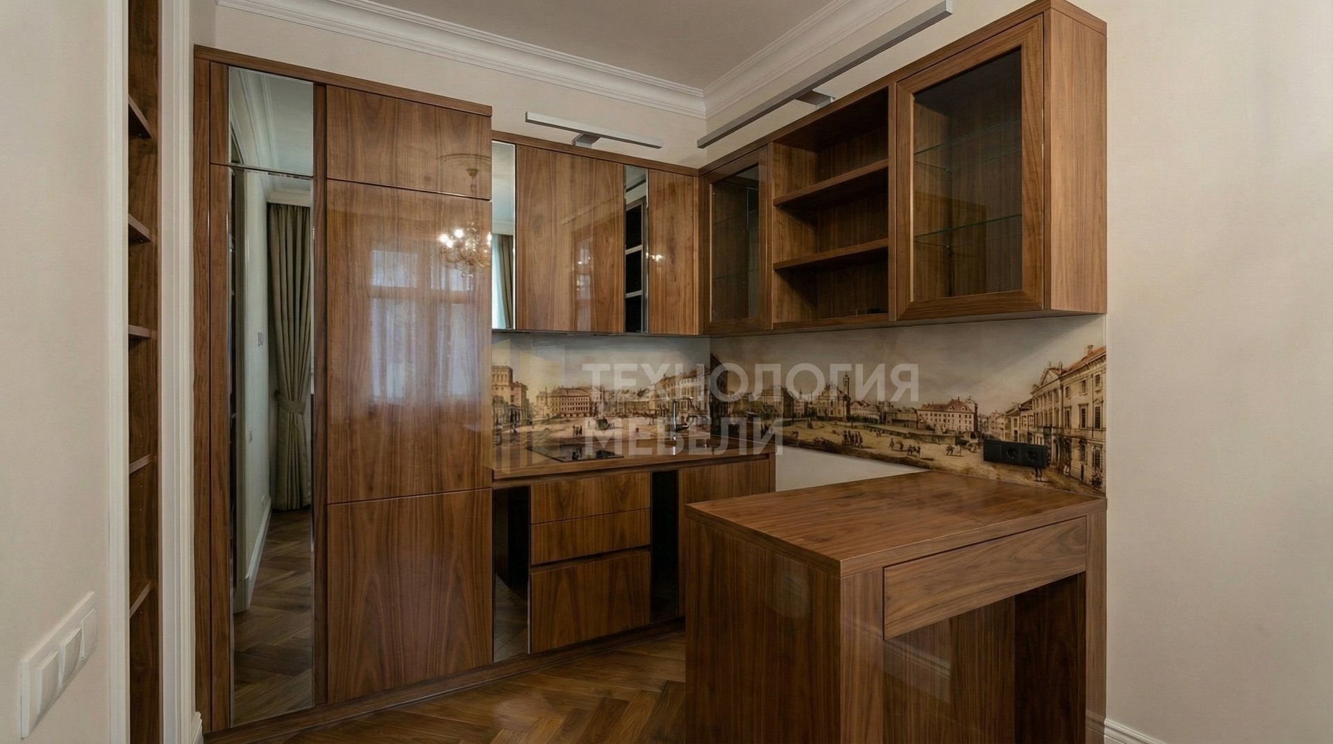 Эта неоклассическая кухня создана для ценителей элегантности и функциональности. В основе — лак/эмаль, компакт-ламинат (HPL) и зеркальные панели, придающие интерьеру изысканность. Цветовая палитра включает графит и бело-алюминиевый, дополненные тёплым орехом фасадов и столешницы. Глянцевые фасады из зеркала графит/бронза, выполненные как стекло в профиле, прекрасно сочетаются с глянцевой столешницей из МДФ цвета орех. Корпус из ЛДСП Kronospan светло-серого цвета. Фартук представлен панелью МДФ под дерево с фотопечатью. Кухня длиной 2.4 м имеет форму с островом, что повышает её эргономичность. Отсутствие ручек с системой Push-to-open подчёркивает минималистичный дизайн. Распашные типы открывания обеспечивают удобство использования. Рабочая зона оснащена накладными профилями подсветки. Верхние модули стандартной высоты дополнены открытыми полками, добавляя лёгкости и пространства. Это идеальное решение для современной кухни, сочетающее роскошь материалов и продуманную функциональность, создающее атмосферу уюта и стиля, очень важно.