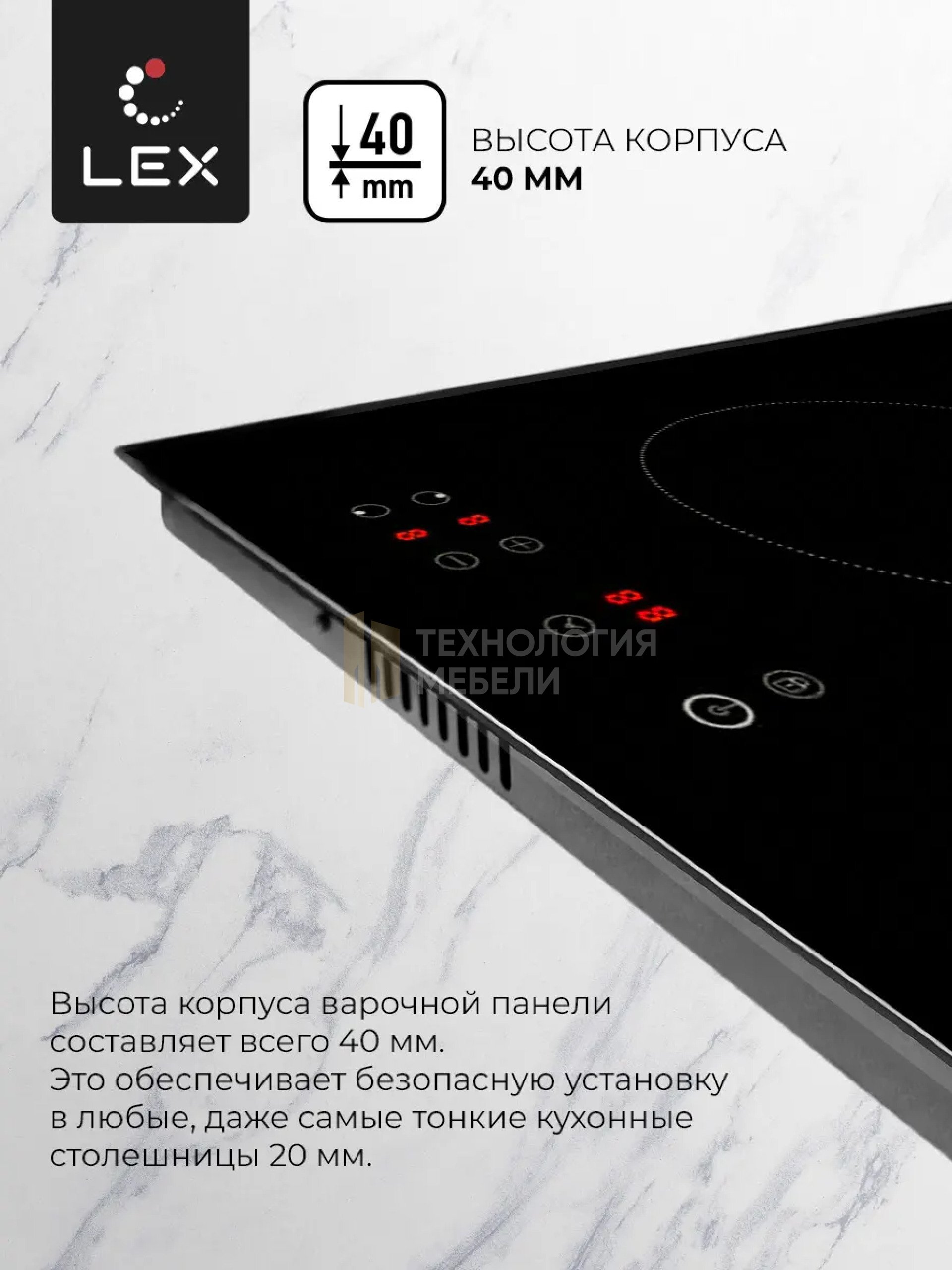 Компактная электрическая индукционная варочная панель Lex EVI 320 BL имеет ширину встраивания 300 мм. Современный индукционный нагревательный элемент демонстрирует высокую скорость нагрева, существенно экономит электроэнергию и сокращает время приготовления блюд. Модель снабжена функцией блокировки панели, индикаторами остаточного тепла, комбинированной системой защиты от перегрева и выкипания, программируемым таймером автоматического отключения, распознаванием наличия посуды. Корпус Lex EVI 320 BL изготовлен из специального изолирующего полимера толщиной 4 мм, которое избавляет от необходимости заземления. Несмотря на общее мнение, что поверхность в индукционной плите не нагревается, это не совсем так. Она нагревается от самой посуды и нужно быть аккуратными. Сразу после снятия кастрюли или сковороды, поверхность горячая, хотя и практически мгновенно остывает. И уже через несколько секунд её можно трогать рукой.