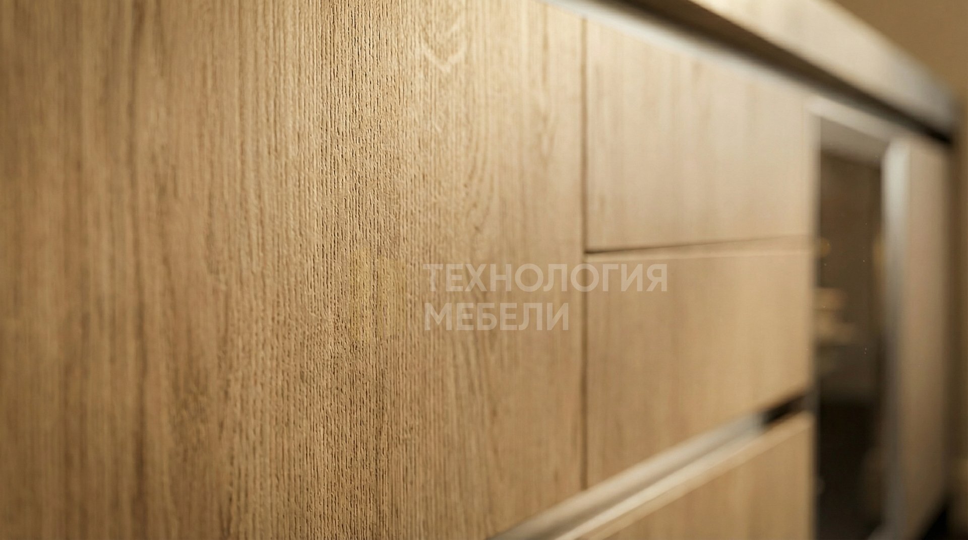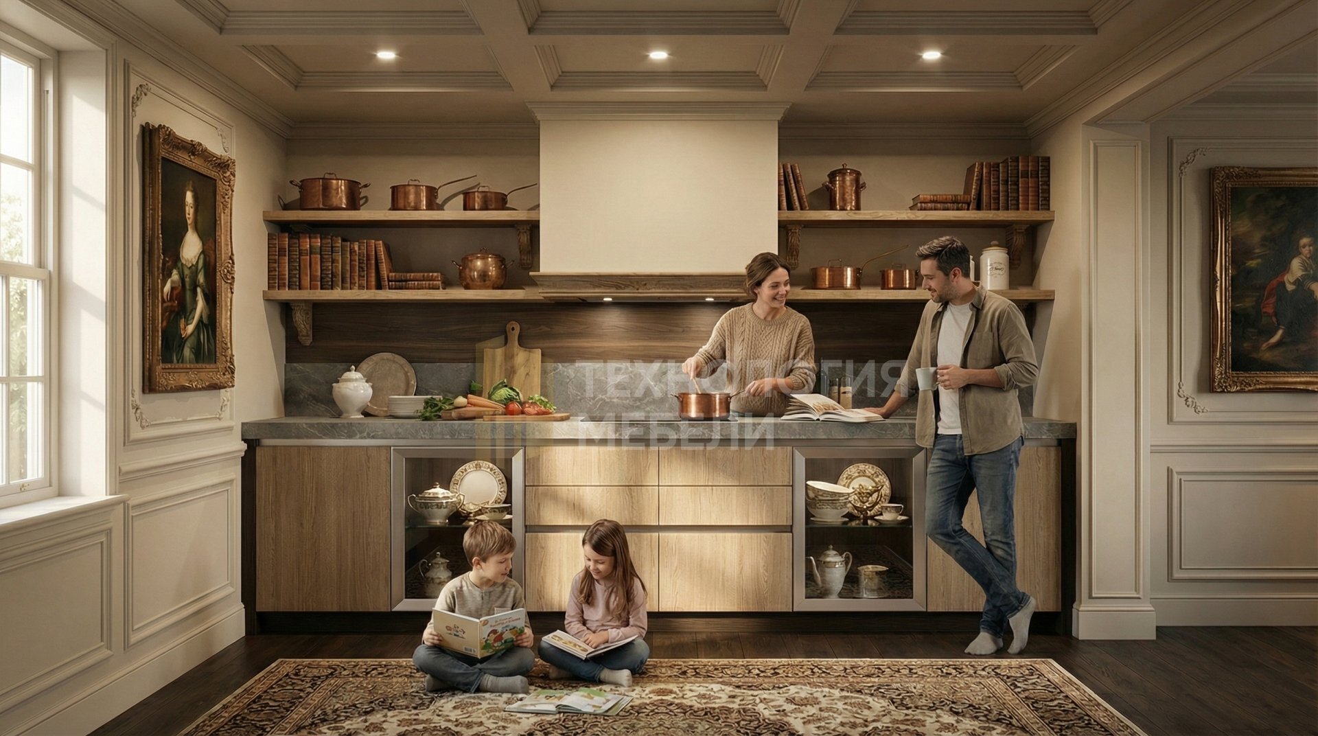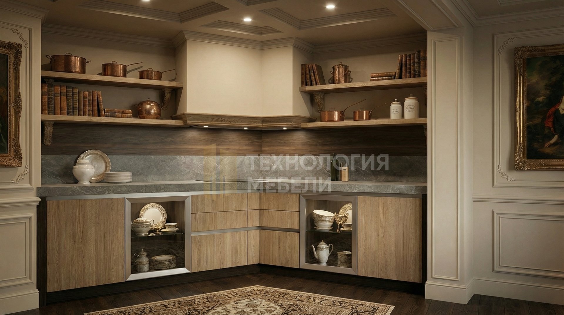 Кухня, выполненная в стиле барокко, имеет длину 3.0 м. Фасады из ЛДСП "Дуб с нейтрально-тёплым подтоном" с древесной фактурой оснащены стеклом в профиле и распашным открыванием Push-to-open, без ручек. Корпус выполнен из ЛДСП цвета Венге. Столешница — кварц под мрамор, цвет Бетон, текстурированная. Фартук — керамогранит под светлый камень, цвет Тёмный орех. Кухня без кухонного острова и верхних модулей, что подчеркивает легкость. Предусмотрены открытые полки. Подсветка рабочей зоны отсутствует, но имеются точечные светильники. В дизайне применен керамогранит. Общая цветовая палитра включает белый, светло-бежевый, серо-тёмный и бело-алюминиевый оттенки, формируя функциональный интерьер.